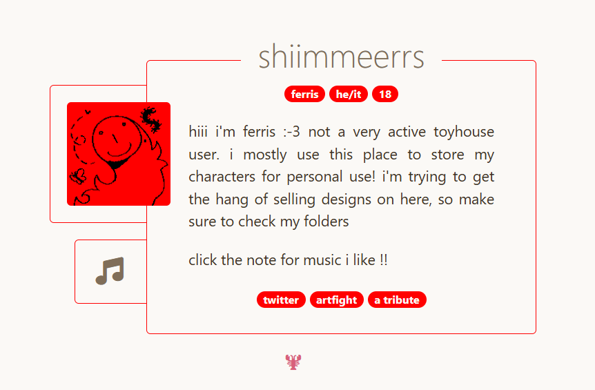 i think having a basic education in coding has definitely made things easier though lol. i think the hardest part has been adjusting to a language mostly focused on website building (i don't know if that's true i'm talking out of my ass). css has definitely been easier to understand than html, but now that i've got a basic understanding of things it doesn't seem as daunting anymore. the only languages i learned in school were C# and C++, and those are much more versatile than either of these. still, it's been very fun to experiment with. i was finally motivated to learn the language for realsies when i customized my Toyhouse account via a template by this user over there <3